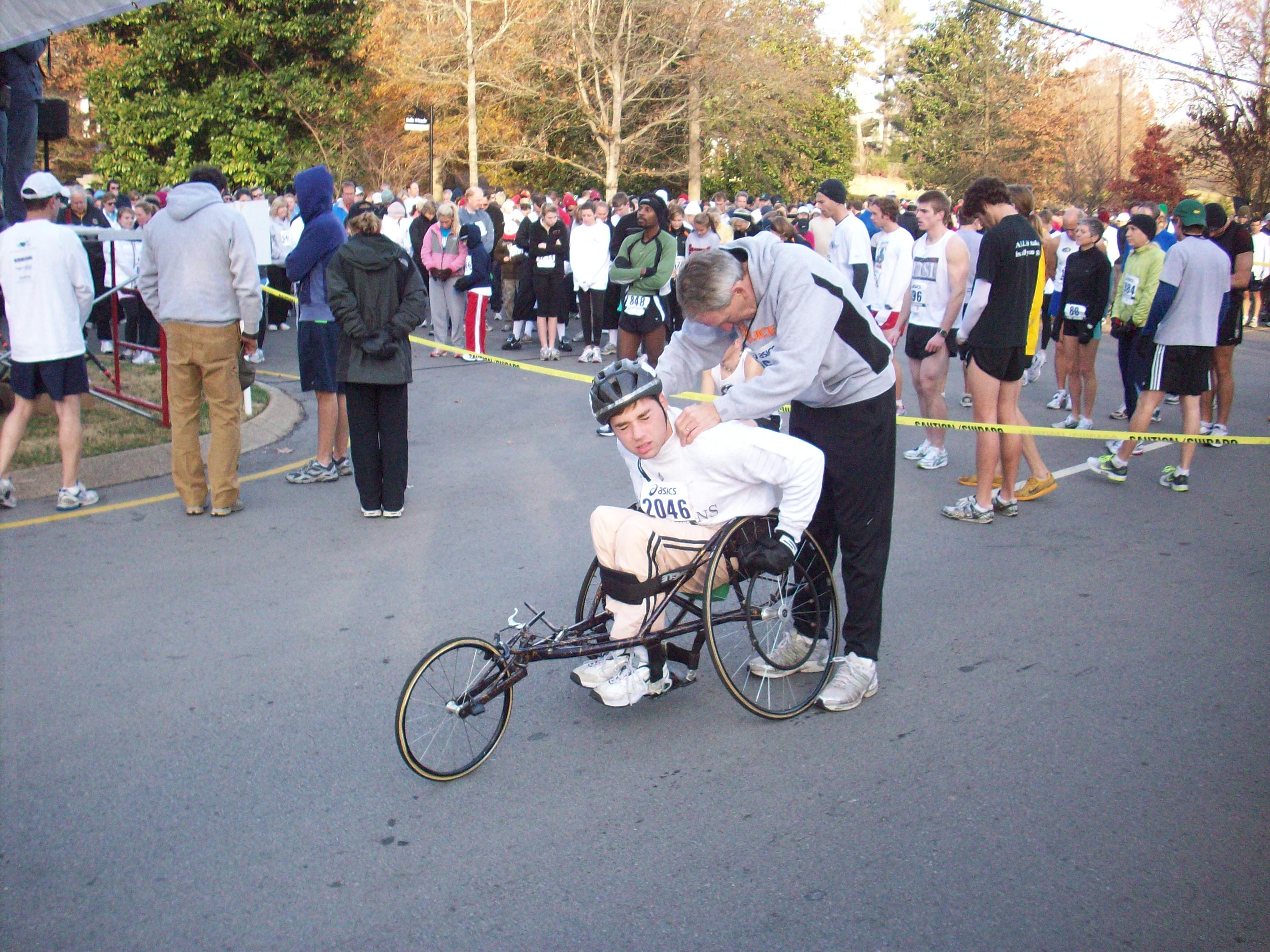 A father warms his son up for the 5-mile race. (Davidson A.M./The Tennessean)
