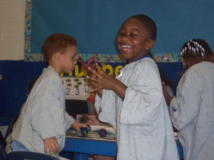 A student giggles at his dirty hands. (Davidson A.M./The Tennessean)